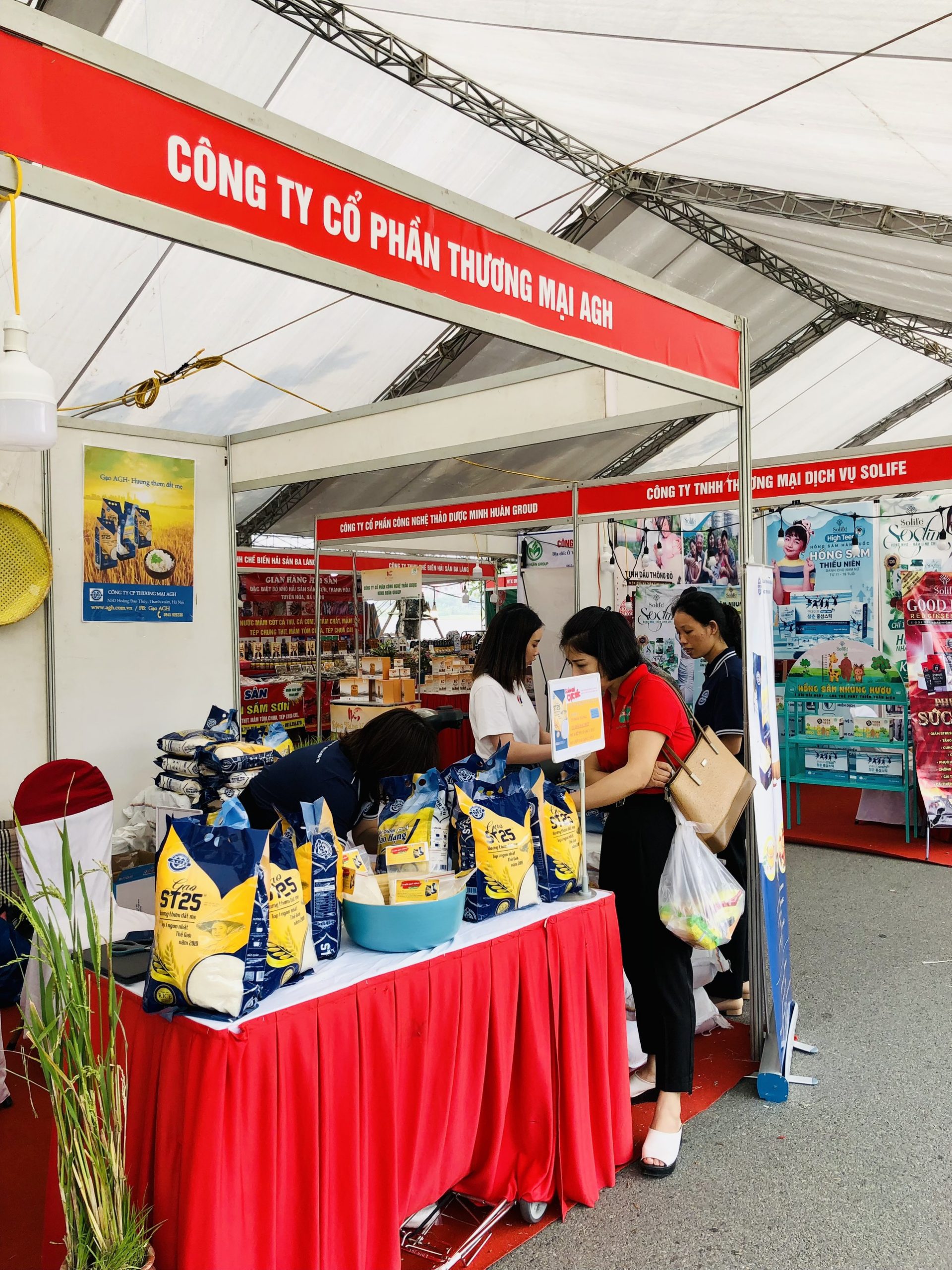 Gian hàng công ty AGH với sản phẩm Gạo lúa tôm ST25 AGH và Gạo lài thơm hảo hạng AGH đã thu hút đông đảo sự quan tâm của khách tham quan. Nhiều khách hàng tỏ ra thích thú khi được tận mắt nhìn thấy các hạt thóc ST25 AGH và Lài thơm hảo hạng AGH.